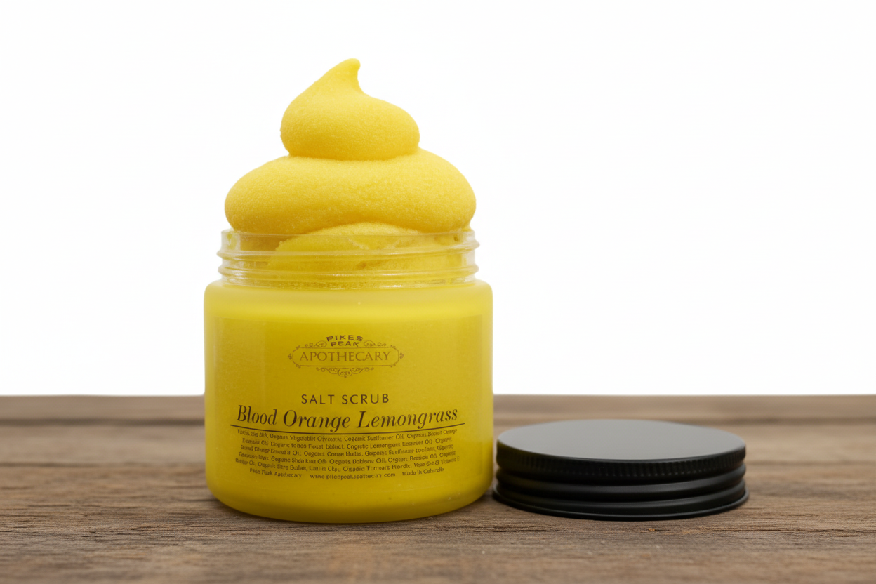 Pacific Sea Salt, Organic Vegetable Glycerin (from Flaxseeds), Organic Colorado Sunflower Oil, Organic Blood Orange Essential Oil, Organic Witch Hazel Extract, Organic Lemongrass Essential Oil, Organic Sweet Orange Essential Oil, Organic Cocoa Butter, Organic Sunflower Lecithin, Organic Carnauba Wax, Organic Shea Nut Oil, Organic Babassu Oil, Organic Baobab Oil, Organic Borage Oil, Organic Shea Butter, Kaolin Clay, Organic Turmeric Powder, Non-GMO Vitamin E from Sunflowers.